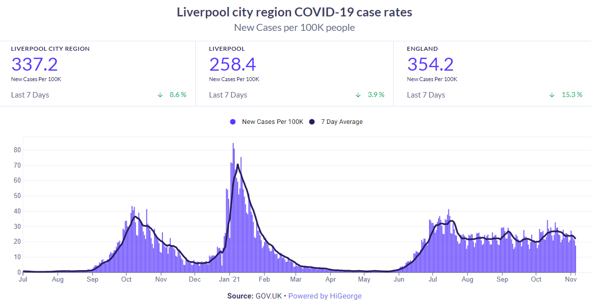 Case rates have been very stable across Merseyside since August, as our dashboard below shows. The current rate (new cases per 100,000 residents over a week) for the Liverpool City Region is 337.2, down 8.6% in a week, compared to England’s 354.2, down 15.3%. Liverpool itself is a bit lower: 258.4, down 3.9%. Case rates are highest in St Helens, around 500 and lowest in Liverpool, around the 200 mark.