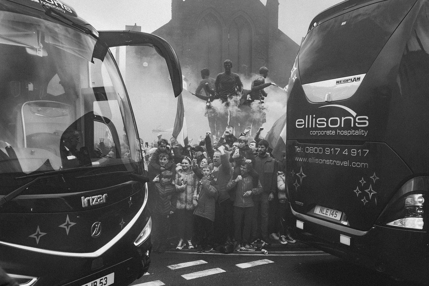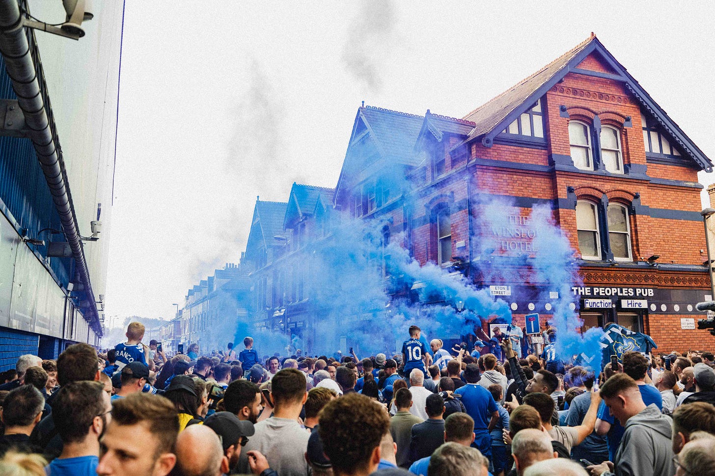 Caitlin Sullivan, a local photographer, began photographing Goodison Park on match days when Everton were facing relegation. “Fans began crowding before the game to cheer the team coach into Goodison Park, as a way to let the team know the fans had their full support no matter what happens,” she remembers. “Being able to capture moments like this is always a pleasure as it shows how much of a family Evertonians are.”