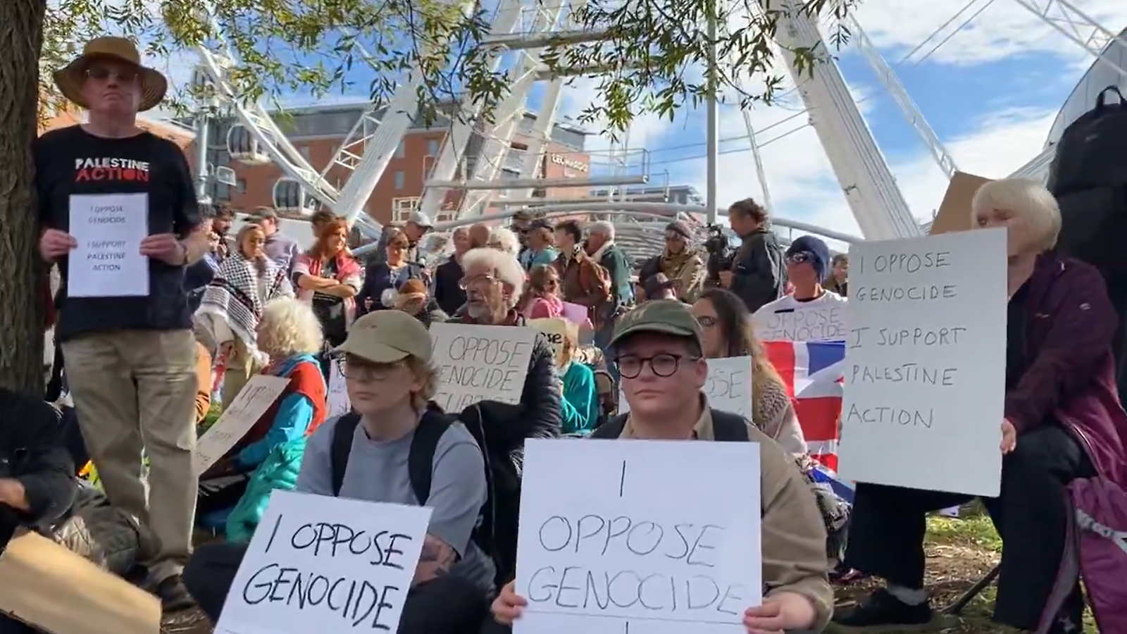 Then on Sunday, Defend Our Juries — a nonprofit organisation seeking to stand up for the right of jurors to acquit defendants according to their conscience — organised a demonstration near the Wheel of Liverpool, the ferris wheel beside the convention centre hosting the Labour Party conference. The purpose of the demo, according to Defend Our Juries, was to call upon the Labour government to lift the ban on Palestine Action. A group of about fifty people sat holding placards reading messages that included "I oppose genocide, I support Palestine Action".