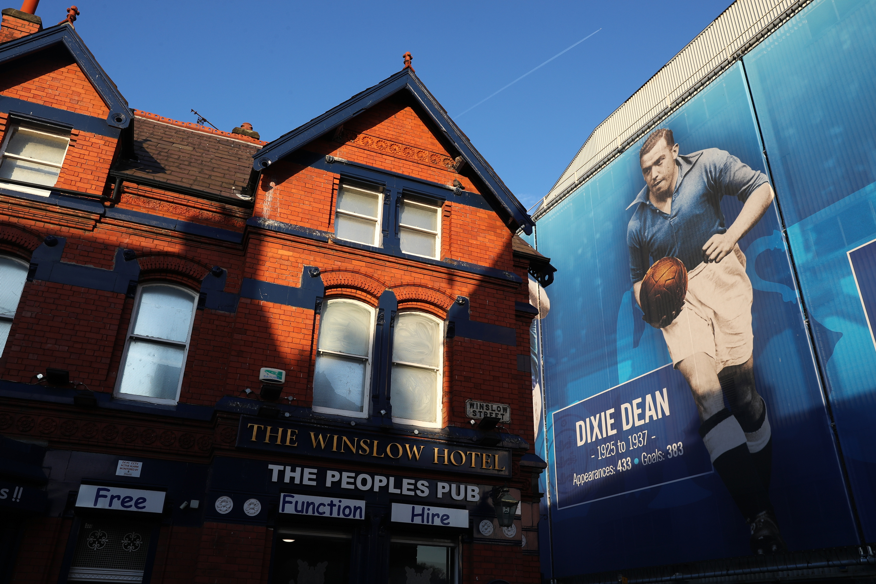 Matchday at Everton. At the top of Winslow Street leading up to Goodison Park fans stand clutching pints in gaggles outside the The Winslow Hotel. The Winslow is also known as the People’s Pub, taking its moniker from ex-manager David Moyes’ nickname for Everton FC, the people’s club.