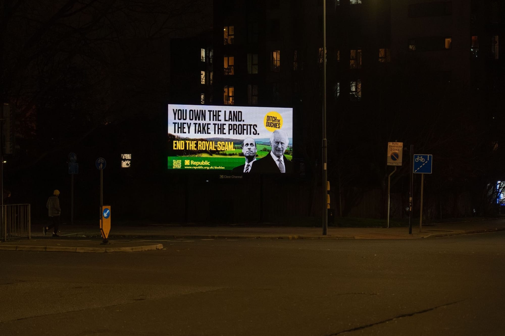 A series of billboards protesting the monarchy have appeared in Liverpool, as part of a growing 'Ditch the Duchies' campaign from anti-monarchy group Republic. The Duchies pay King Charles and Prince William personal incomes of £27 million and £23 million respectively — despite the land being public property, not private estates. The billboards, which are on Leeds Street, Scotland Road and the Kingsway Tunnel Buttress Wall, read: 'You own the land. They take the profits'.