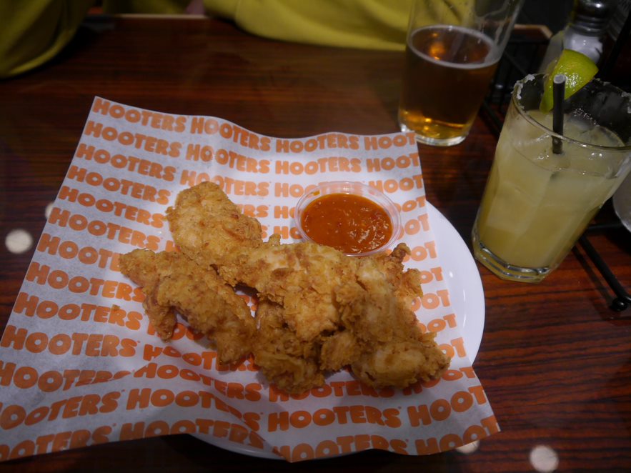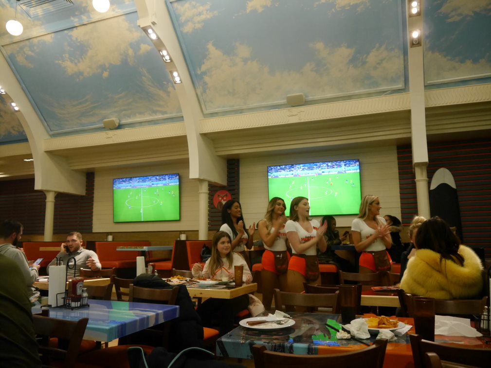 Whether or not they like stirring the pot, it would be hard to deny that people aren’t voting with their feet. The following week, we visit Hooters again. It’s the England vs Wales World Cup match, and every part of the restaurant is a tug of war for attention: football on screens covering every inch of the walls, singing and dancing, merchandise, chicken wings floating past on large silver platters, Hooters lager being poured into thin plastic pint glasses. It is packed to the rafters and the atmosphere is convivial, and we struggle to get a table.