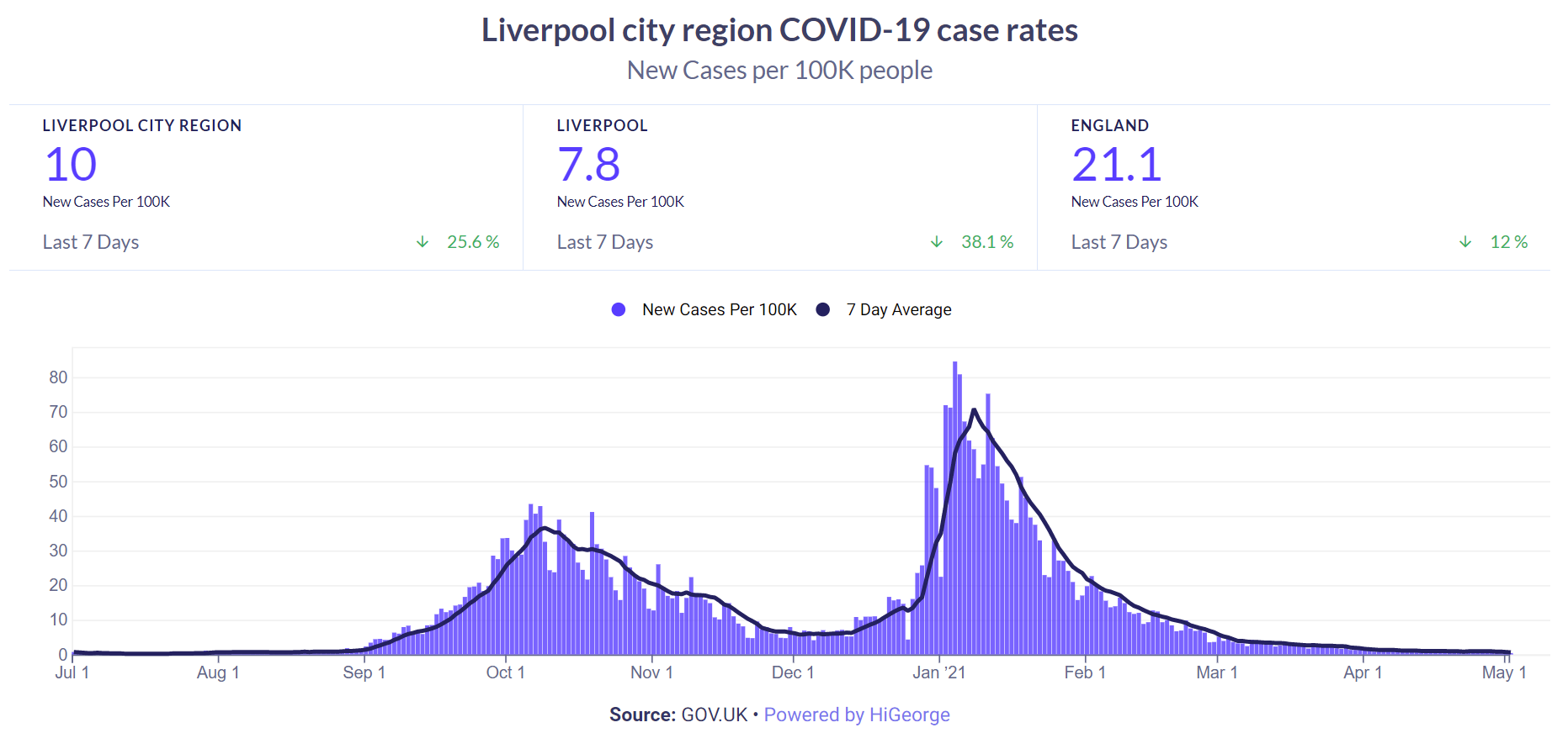 - Covid-19 update: Case rates (the number of new confirmed cases per 100,000 residents) in both Liverpool and across the city region are down to extraordinarily low levels now. The city region rate is 10, down 25.6% on the previous week. The Liverpool rate is 7.8, down 38.1%. Those rates compare with 21.1 for England as a whole, down 12%. See our dashboard below, which updates every day here.