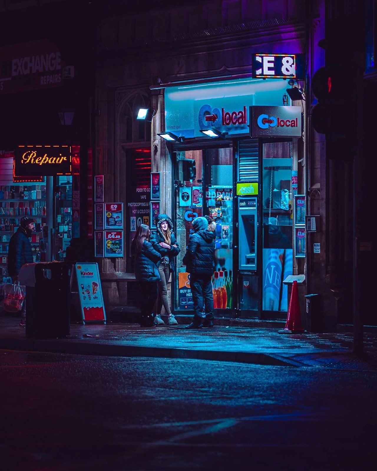 Mark Parsons, whose brilliant street photography of Liverpool can be found here, with an atmospheric late night shot of a shop doorway in the city centre, with Kinder ice cream and elf bar advertising on full display.