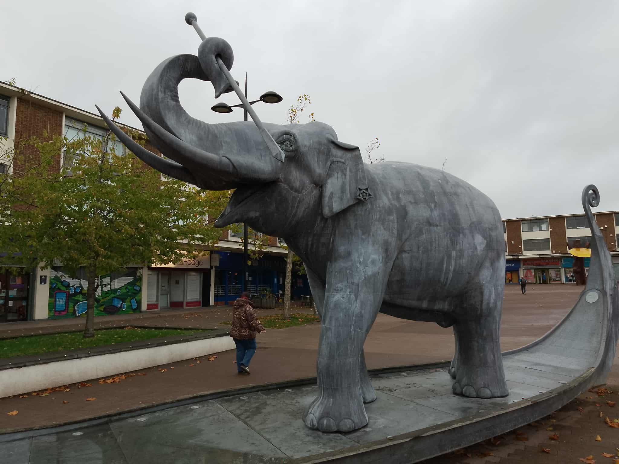 Also in the centre are two unusual public sculptures. The first is the Huyton Tree, a garish metal cast of a 400-year-old dead tree in Huyton, complete with a giant yellow disc wedged in its artificial branches. (“So the sun never sets on the Huyton Tree,” Smith says drolly.) The second is a giant silver elephant in a boat to commemorate the poet Edward Lear, who in the 1830s painted the menagerie at Knowsley Hall, some five miles away. Some anonymous artist has silly-stringed the elephant's eye.