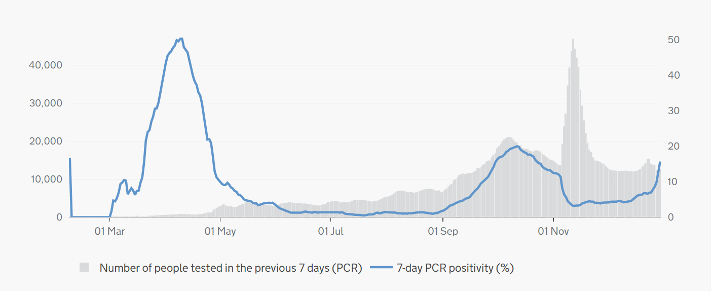 The positivity rate (the percentage of people who took a test and got a positive result) was around 5% a fortnight ago in the city of Liverpool and has just risen to more than 15% on a 7-day average. That’s for the old-style PCR tests, but you wouldn’t see that kind of increase in positivity if the virus wasn’t spreading. Positivity peaked in October at 20%. Look at the blue line in the graph below, which is for Liverpool itself.