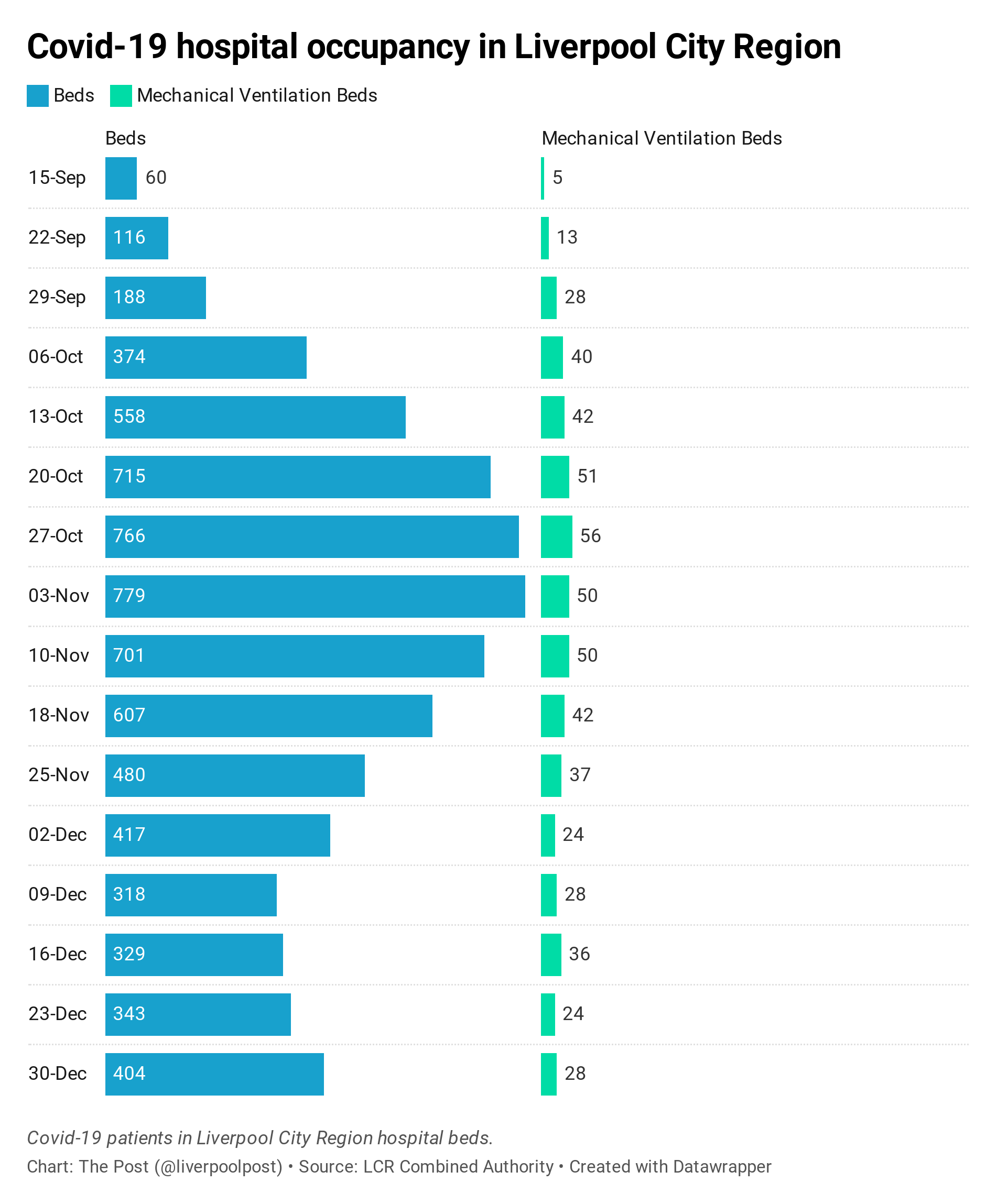 There are currently 404 Covid-19 patients in the city-region’s hospitals, and 28 in mechanical ventilation beds, which roughly equates to intensive care beds. That compares to almost 800 patients and 56 on ventilators during October’s peak.