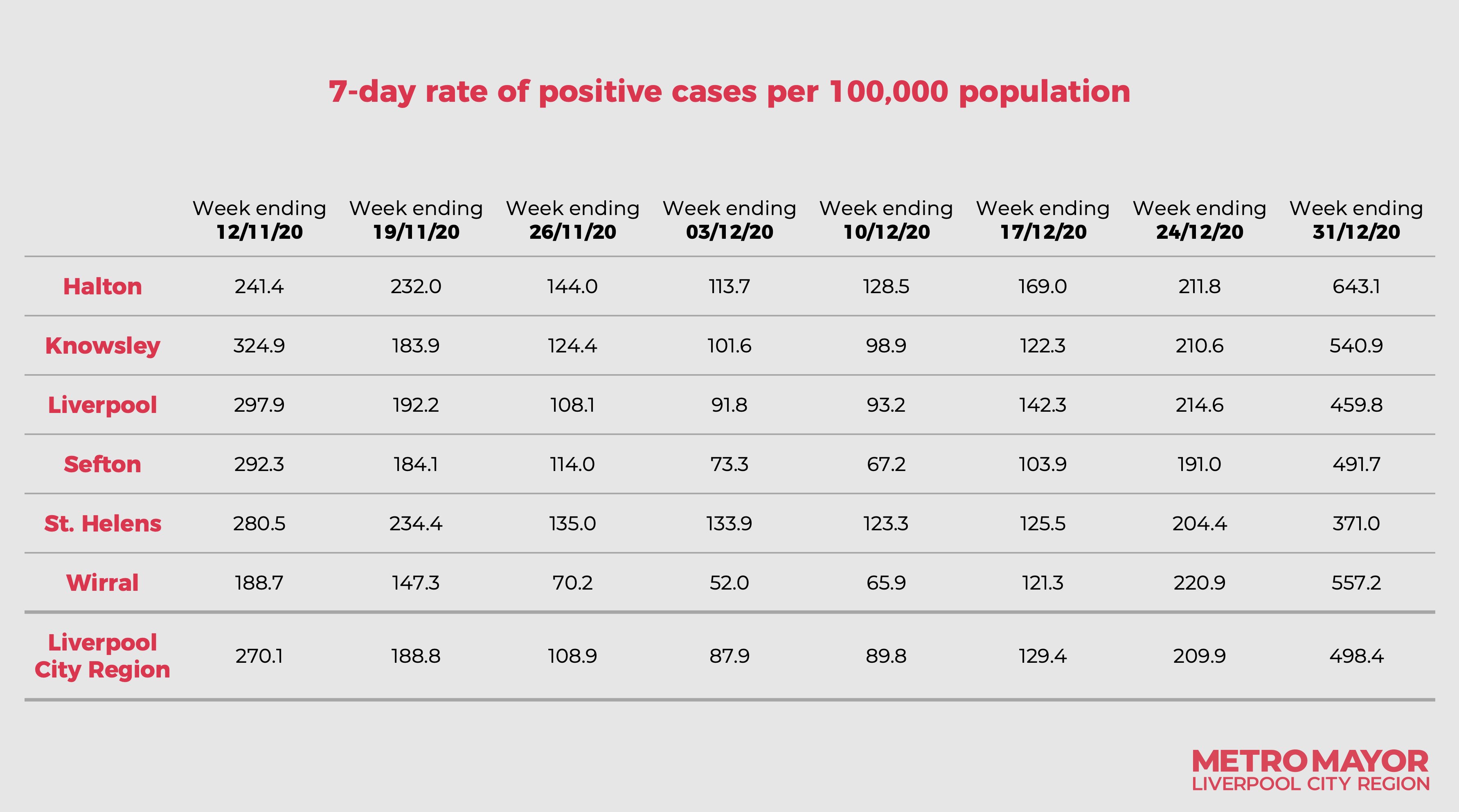 “Given the rapid rise in infections, an effective national lockdown is the right thing to do.” That’s the view of Steve Rotheram, the city-region mayor. He’s referring to the trend you can see in the graph below, which shows case rates (new cases confirmed in a week per 100,000 residents) soaring in the week ending December 31st.