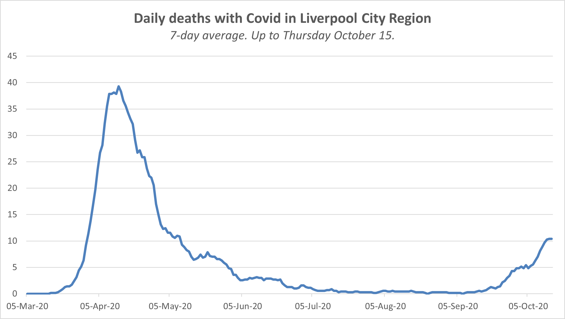 Across the Liverpool City Region, around 10 people are dying in our hospitals per day having been diagnosed with Covid-19. That’s the 7-day average of daily deaths up to last Thursday. It doesn’t necessarily mean all of these people are being killed by Covid, but it’s how the NHS records these numbers.