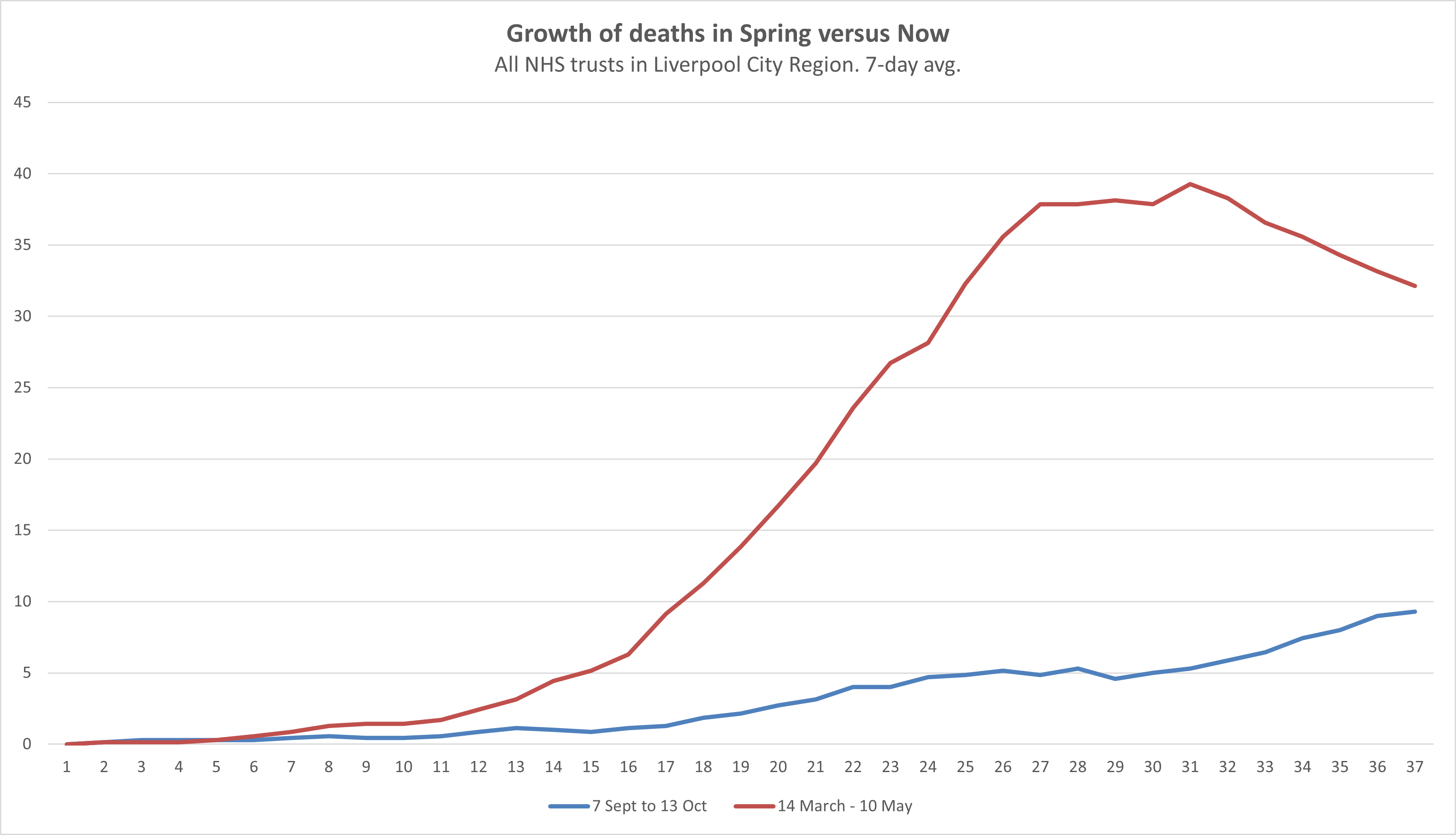 Looking forward, and especially because we are heading into the season when the NHS is always extremely stretched, it’s worth looking at how fast the death number is growing in the Liverpool City Region. Is the death number skyrocketing like it was in April? The answer is no. I’ve done this graph of how deaths have grown over the past 36 days versus how they grew in the 37 days before the peak. The red line is the period from 14 March, the blue one is the 37 days before last Tuesday.