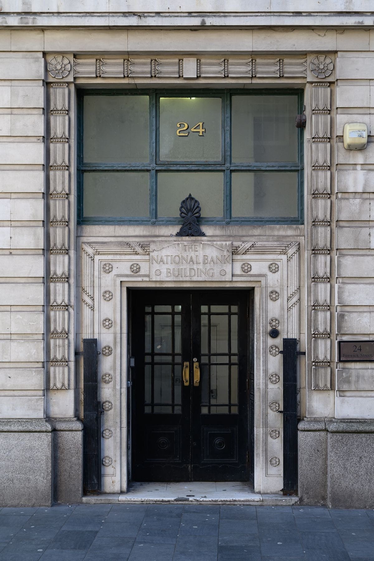 Let’s start with the facts — and the building itself. Established as the National Bank of Ireland in 1835 and headquartered in London, the National Bank Limited operated a network of branches across England and South Wales before shuttering its doors in 1970. Its Liverpool branch opened on the corner of Fenwick Street and James Street in 1923 and was a sight to be seen: designed by Castle Street architects Messrs T Arnold Ashworth & Son’s, Greek influences can be read across the facade in the mix of column elements and ribbons of Meander motif. By 2000, the upper seven floors, all former offices, had been converted into 28 flats.