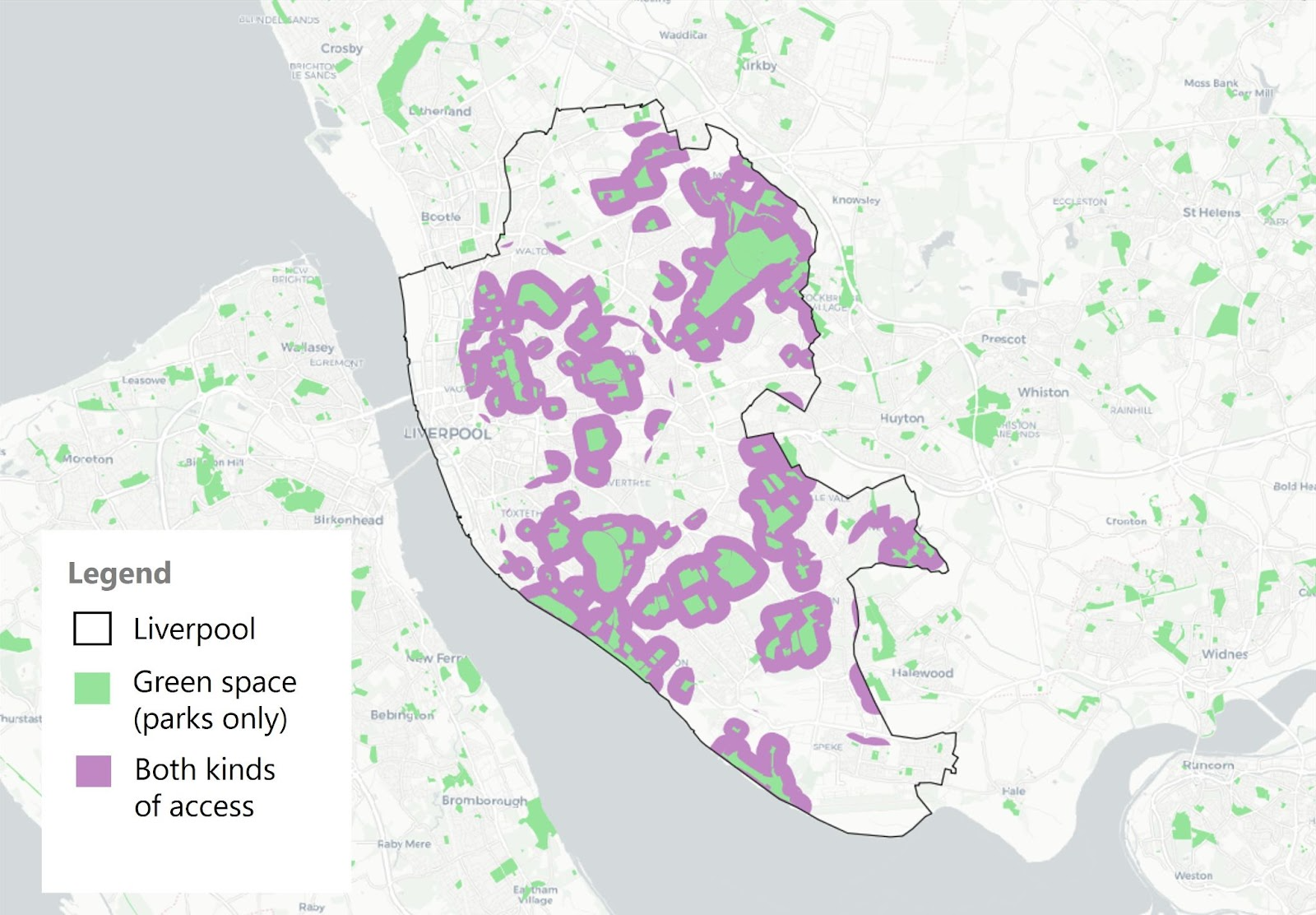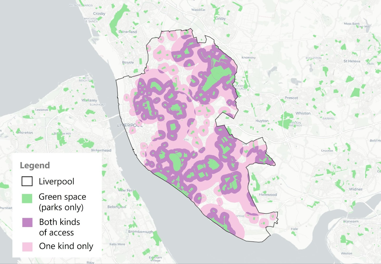 While most of the rest has access to either the neighbourhood or a doorstep/local green space, a fifth of the whole city has neither form of green space access. These issues are especially acute along the docks, the city centre and parts of Speke and Garston, as well as patches in the north like Norris Green.