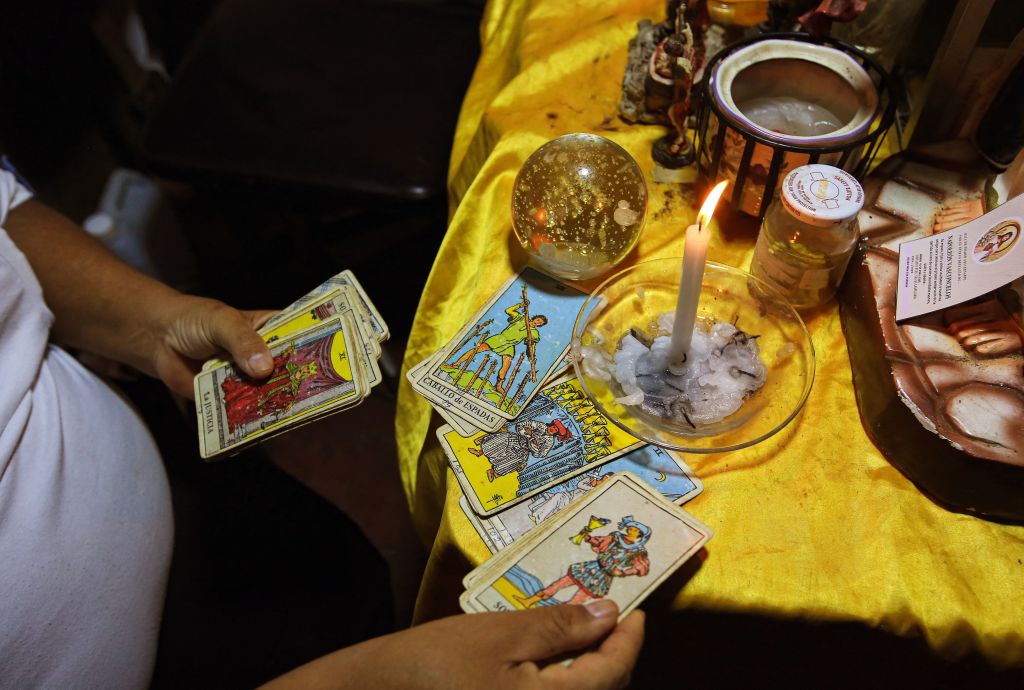 She swings a crystal over the cards: “I’m way better at alchemy than I am at dowsing, but let’s see what happens…”