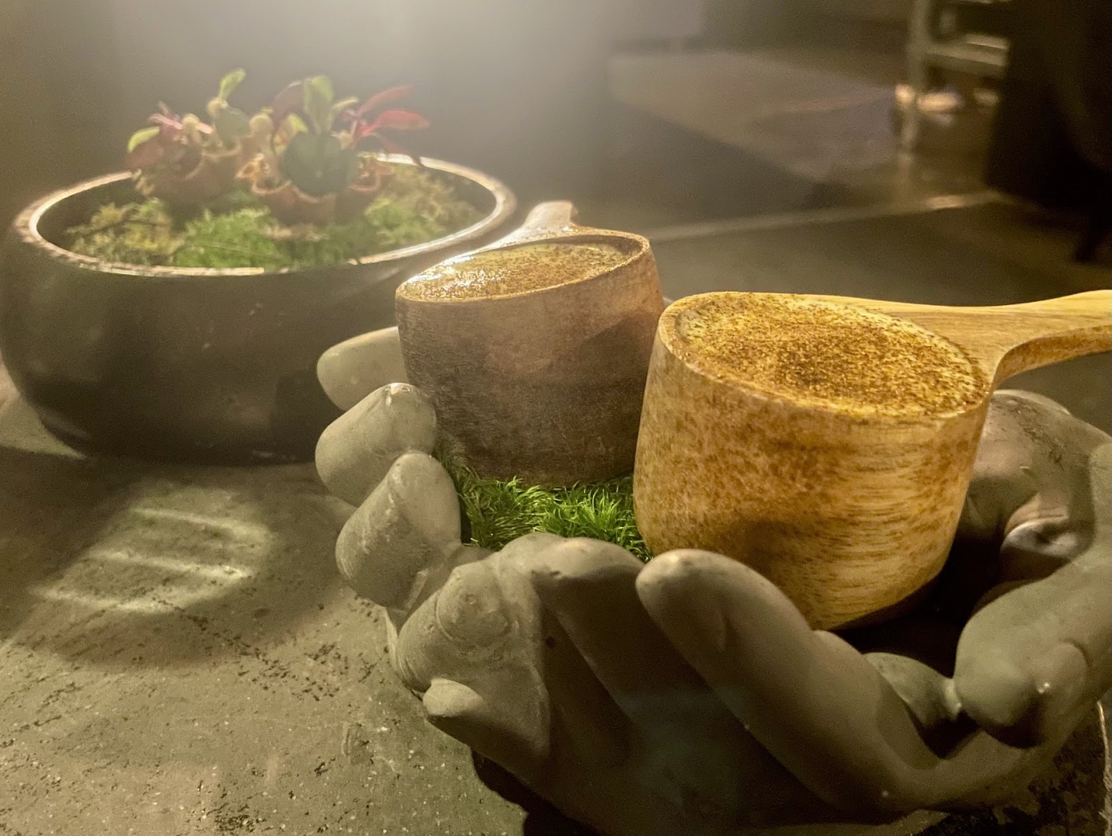 A pair of thick black curtains opens to reveal a brigade of earnest young men carrying out keyhole surgery on microgreens with tweezers. Behold! The precisely made snacks cometh. They announce their precisely-made credentials by being presented on beds of decorative grains and miniature mossy rock gardens, cupped in beseeching pairs of clay hands.