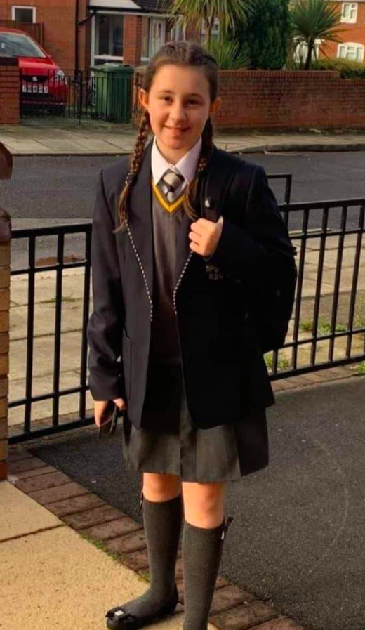She’s wearing her school uniform for Notre Dame Catholic College in Everton, her hair neatly plaited and tucked behind her ears. Standing in the drive outside her home, her grey socks are pulled up to her knees. In her right hand, she’s holding a phone that looks much too large for her 12-year-old hands.