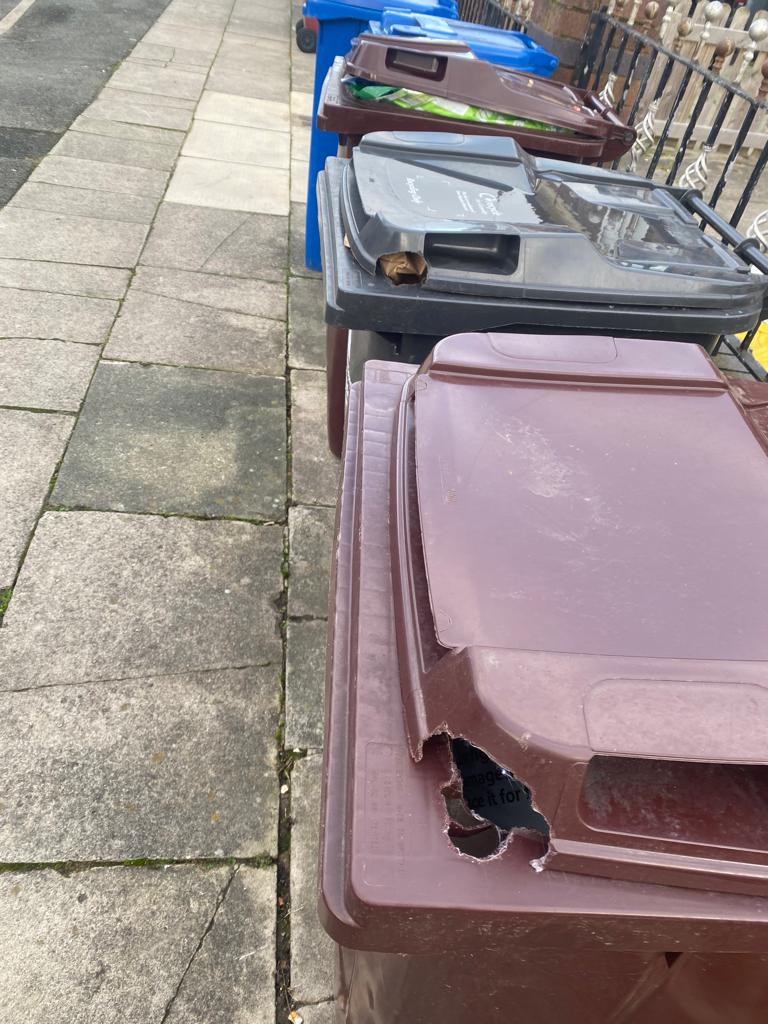I stop to photograph some chewed up wheelie bins a little further up just as its owner pops her head out the front door. “You tell her what’s going on John,” she said. “They got replaced at the last day of action, just look at the state of them now.”