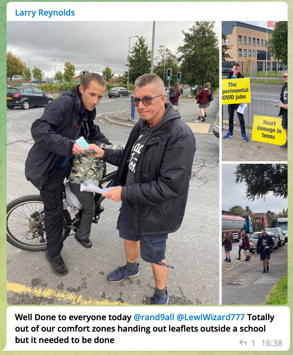 We’ve found that many of those efforts are organised via these Telegram groups. Three men posted in Liverpool Fight for Freedom with pictures of them leafleting a school in Ormskirk, writing that they felt “totally out of our comfort zones handing out leaflets outside a school but it needed to be done”.