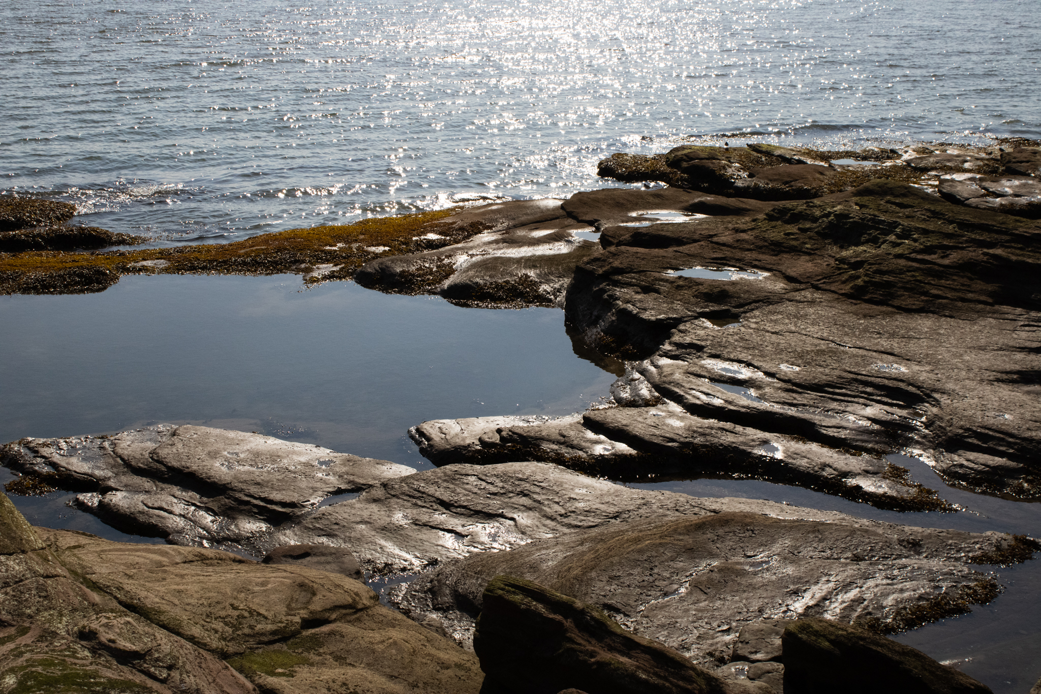 I find a neat cove on the northeast edge and climb down to sit. The sun has been falling on the rocks like a blacksmith’s hammer and the red sandstone is warm to touch. Bobbing in the water are a dozen North Atlantic seals who look like slippery, grey bald men with eyes as black as cherries.