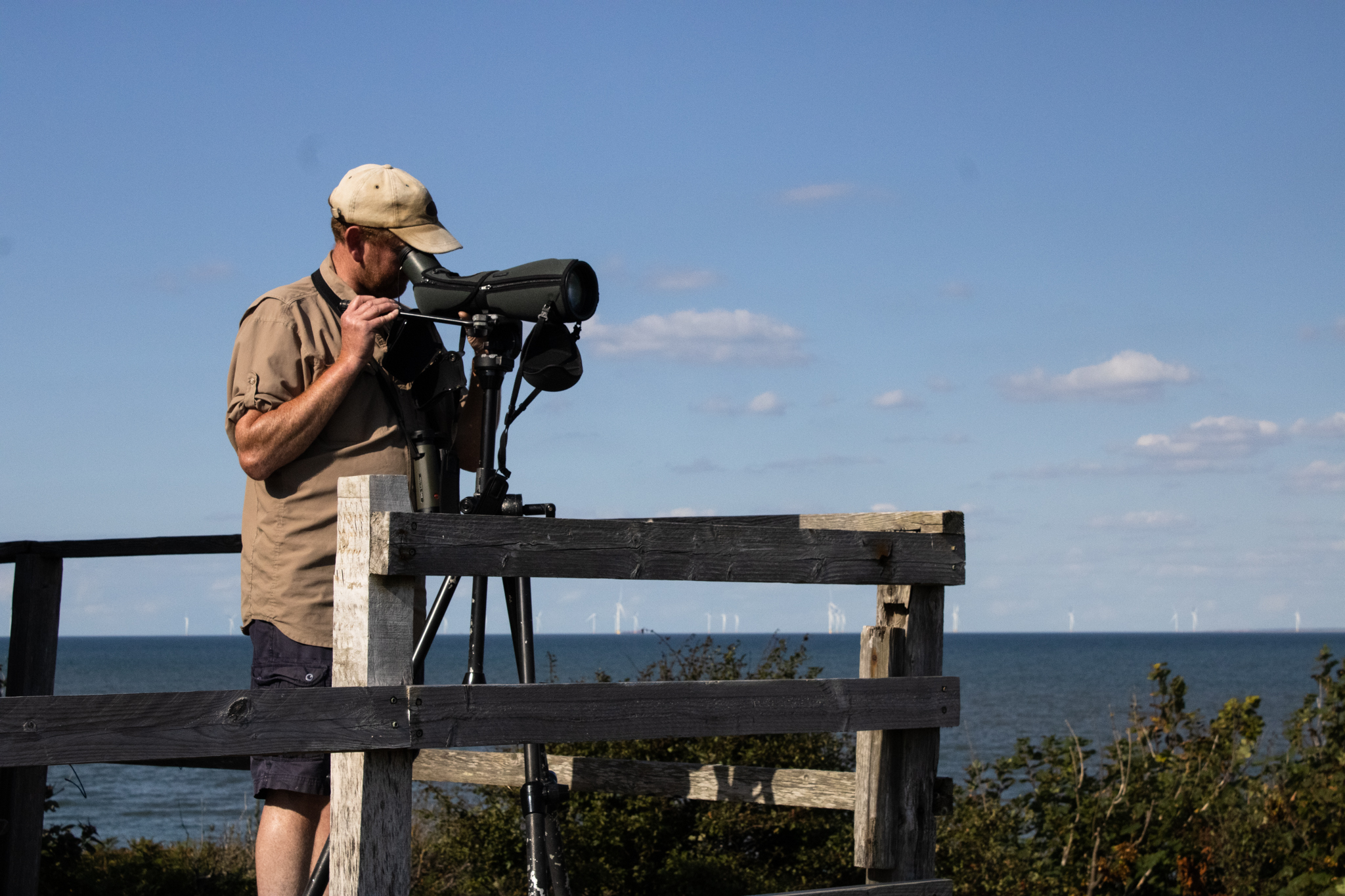 “It’s like coming back in your living room after a load of hassle,” he says, stood beside his telescope, wearing the garb of an outdoorsman — all light beige — and sporting a ginger beard. He’s on the balcony that hugs one side of the Hilbre Bird Observatory, off the coast of West Kirby, watching the tide come in.