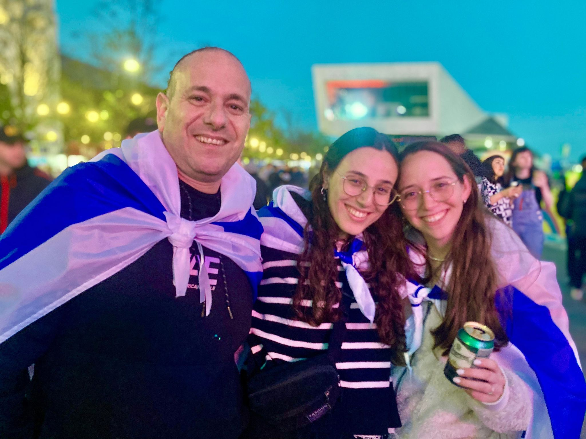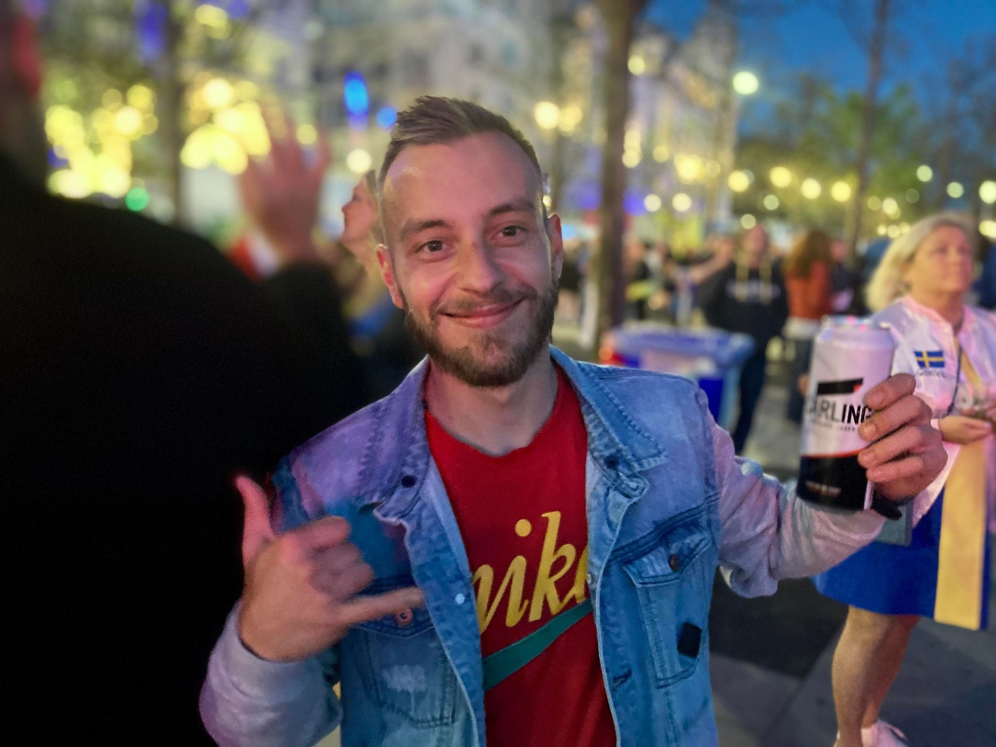 Gareth and Samuel from Spain are sitting next to the water in the main village. It’s Samuel’s third Eurovision. Gareth’s first. How did they meet? They laugh. “Online.” When they started talking on a dating app they were listening to the top 250 together, and they bonded over music — Eurovision in part — and romance blossomed from there. When the Spanish entry qualified they both cried. Round the corner are Nadav, Dolev and a friend whose name may also end in v, all from Israel. They’ve arrived today. They’ve got Israel flags tied around their necks and swig from a cheap bottle of wine. “Great job, great atmosphere!” they say, virtually in unison.
