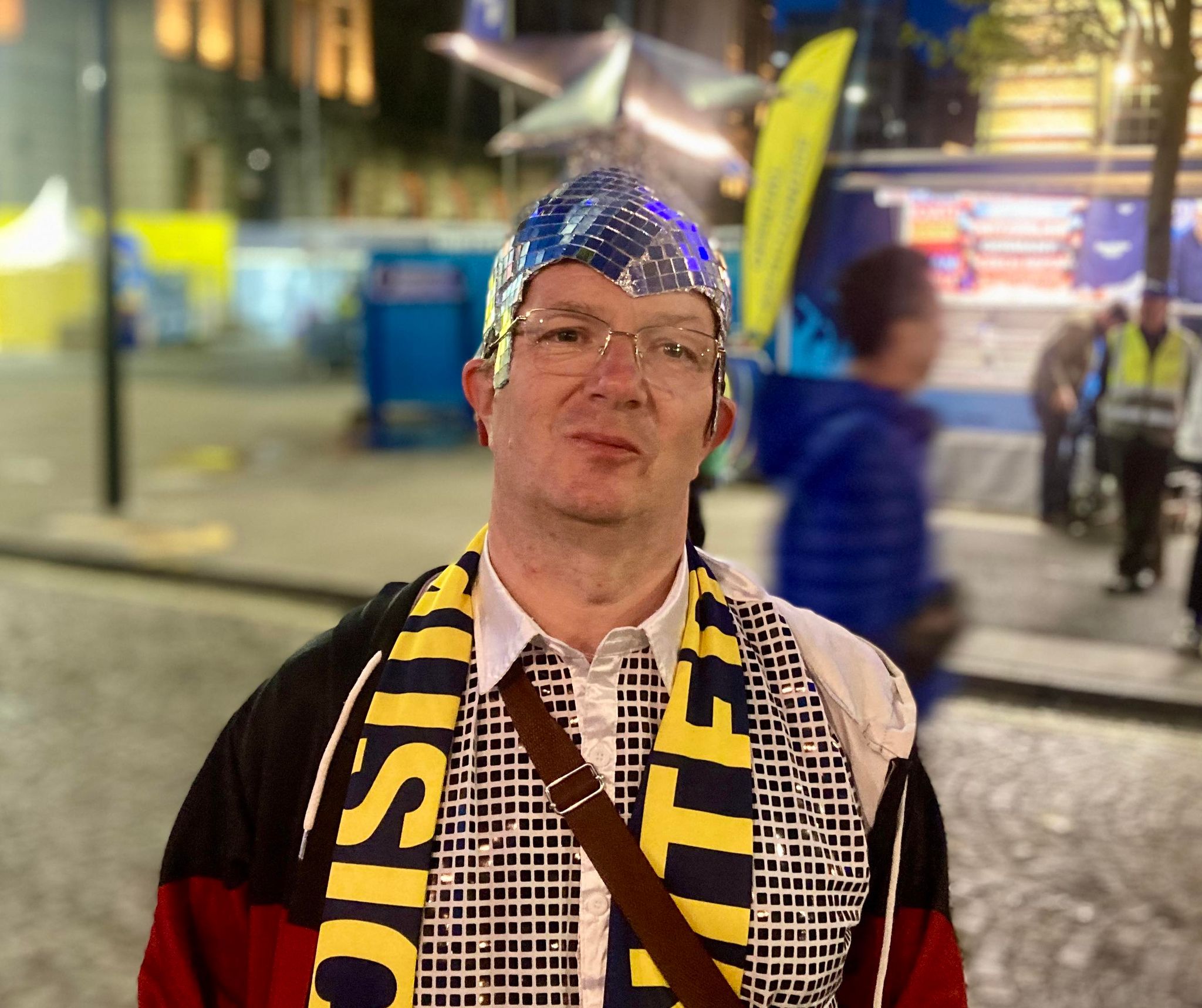 Tim has the zeal of a missionary on all things Eurovision. “I’ve seen people criticise [it] as being cheap but it isn’t. There’s a real effort that goes in, of effort and time,” he says. No one defines this quite like he does. His outfit took two full days to make and his shoes look like they’ve been lent from the Back to the Future prop department. A labour of love. They light up! With his hat — the home-made product of cling film, paper mache and kitchen foil — a silver star protrudes from a disco-ball headpiece (a nod to Ukraine's 2007 entry Verka Serduchka, Ukraine, obviously). “I’ve spoken to people all over the world here this evening, we’ve sung songs in all different languages together. Where else are you gonna get that vibe?”